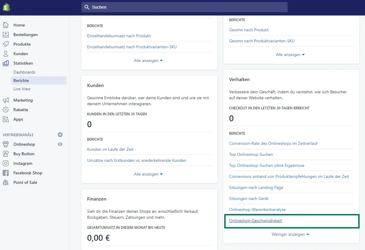 So findest du den Geschwindigkeitsbericht bei Shopify