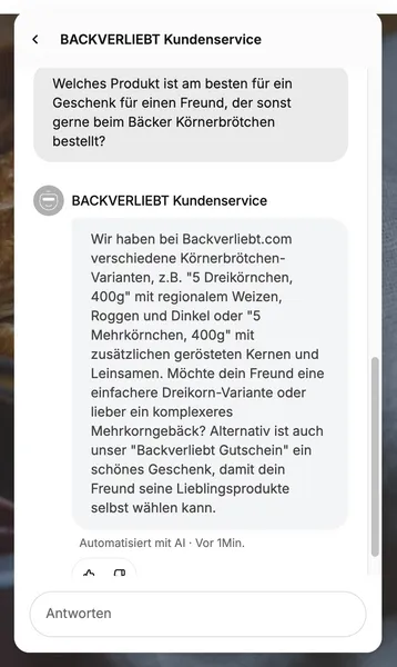 - Standardfragen im Handumdrehen lösen: Ob es um den “Status meiner Bestellung”, die “Lieferzeit” oder die “Rückgaberichtlinien” geht – der Bot erkennt die Absicht des Kunden und gibt die richtige Antwort, ohne dass ein menschlicher Agent eingreifen muss.