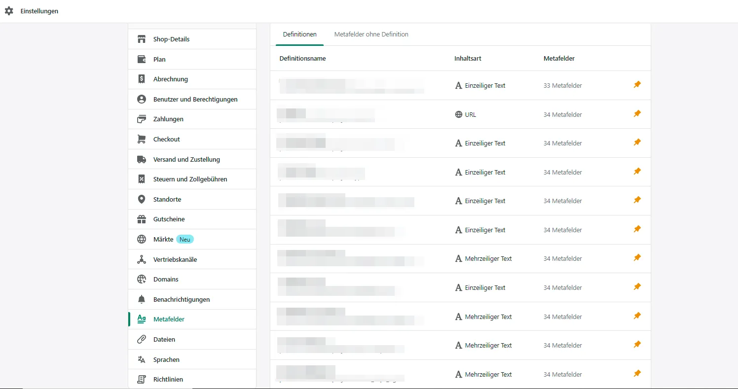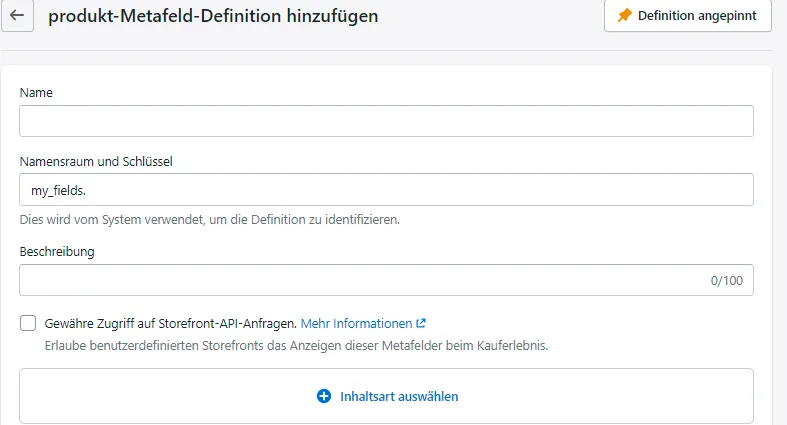 Anpinnen: Wenn du willst, dass deine Metafields beispielsweise bei deinen Produkten/Kategorien im Backend stets als Eingabemöglichkeiten angezeigt werden, kannst du sie anpinnen. Dafür musst du einfach auf dieses Symbol klicken: