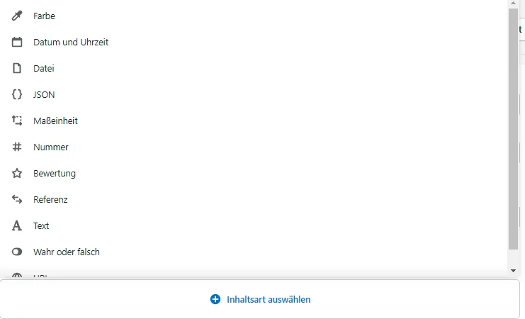 Anschließend kannst du auswählen, welche Art von Inhalt mittels diesem Metafield implementiert werden soll. Also z.B URL, Text, Farbpicker, ein Datum oder Bewertungssterne.