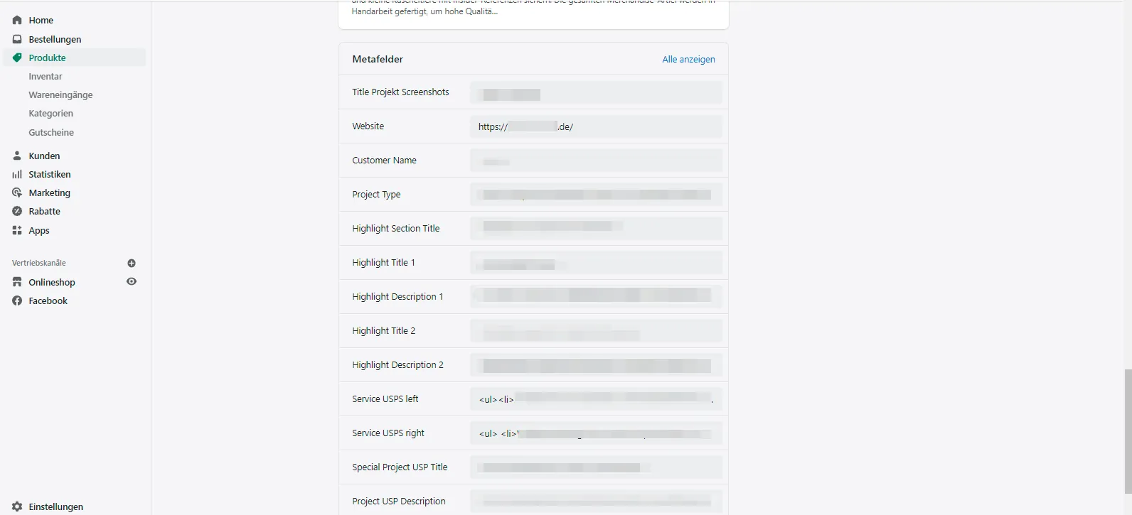 Produktmetafelder benutzt man, um Zusatzinformationen für unterschiedliche Produkte darzustellen, z.B. Material, Hinweise zur Reinigung, individuelle Lieferzeit oder eine Begrenzung für den Garantievertrag.