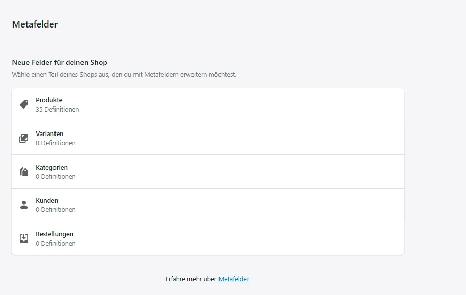 Mit Metafields kann man benutzerdefinierte Felder zu Produkten, Produktvarianten, Kategorien, Kunden und Bestellungen, Seiten, Blogs und Blog-Beiträgen hinzufügen. Sie helfen, zusätzliche Informationen zu deinem Shop hinzuzufügen, die nicht in der Grundausstattung von Shopify enthalten sind.